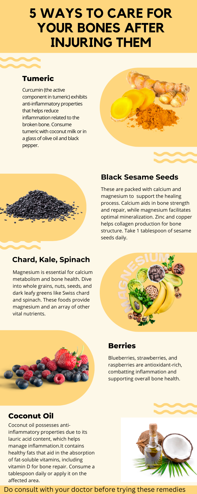 Healing bones after an injury takes time, but the right foods and natural support can make a difference. Natural remedies for bone healing—like turmeric, sesame seeds, leafy greens, berries, and coconut oil—can help reduce inflammation, strengthen bone tissue, and speed up recovery. By adding these powerful ingredients into your daily diet, you give your body the nutrients it needs to repair and rebuild.