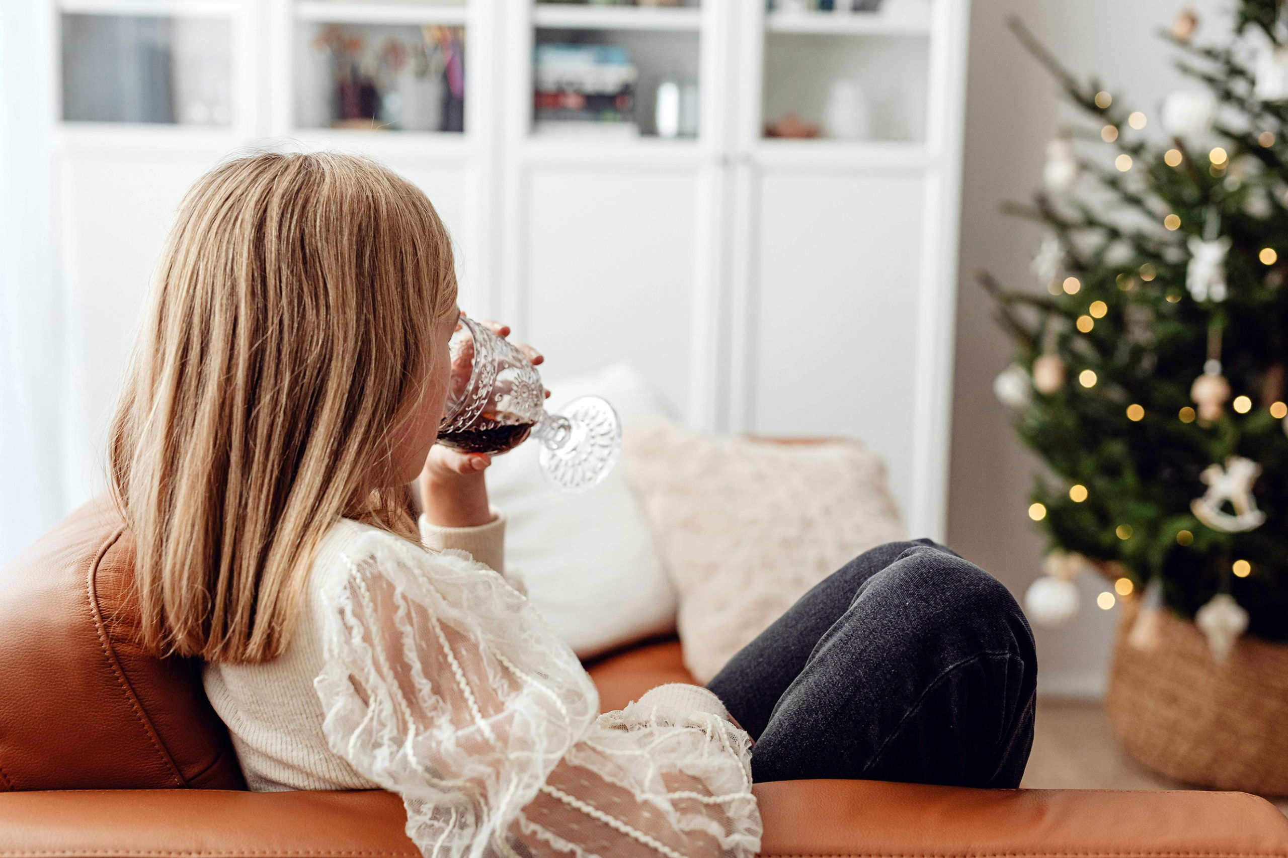 Woman sitting alone at home during Christmas, quietly drinking by the tree.