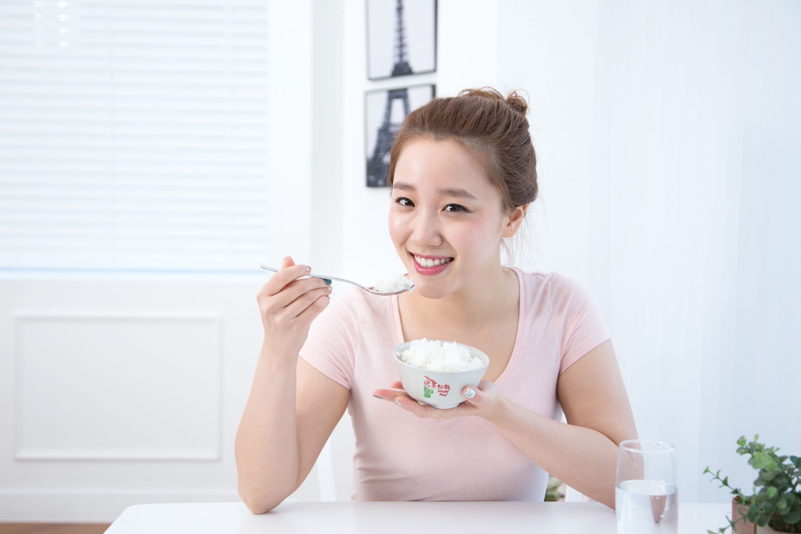 Young female Asian eating a bowl of SōngHè rice in white interior room