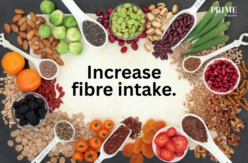 • Increase dietary fibre intake from whole grains, fruits, and leafy vegetables.