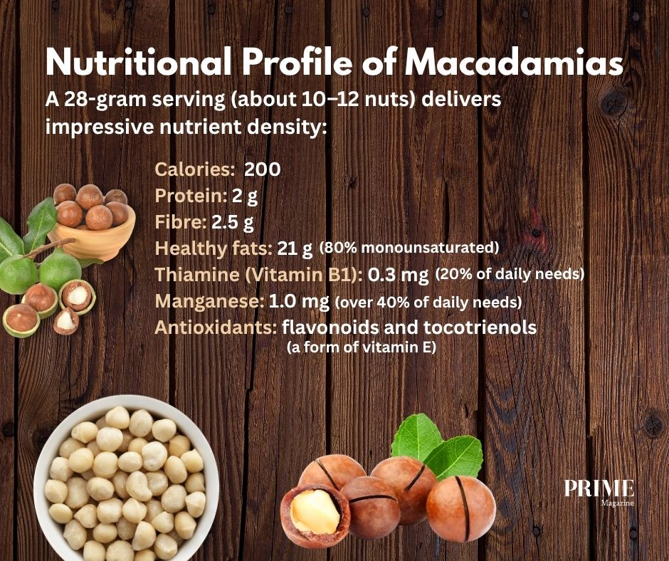 While calorie-rich, macadamias provide “good fats” similar to those found in olive oil, supporting long-term cardiovascular and cellular health.