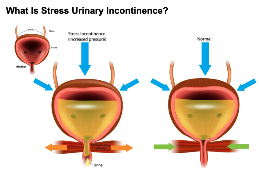 Urinary incontinence occurs when you are not able to control a urine leak. In particular, stress urinary incontinence (SUI) happens due to a sudden increase in intra-abdominal pressure that affects the urethra (thin tube that carries urine out of the body). This can be triggered by various activities such as sneezing, jumping or doing core exercises. In more severe cases, even simple movements like standing up from a seat can trigger a leak.