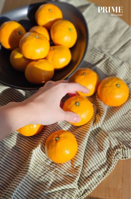 Fresh Mandarin Oranges on a Table with Hand Reaching