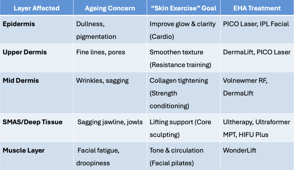 At EHA Clinic, we’ve designed a layered, energy-based facial regimen that acts as a personalised “skin fitness programme” – without needles or downtime.