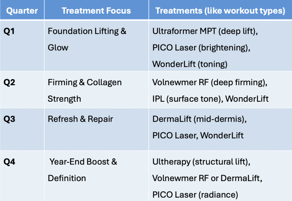 Each treatment is a precision-targeted workout for a specific “muscle group” of your skin. Just like in fitness, combining multiple forms of exercise delivers the best results.