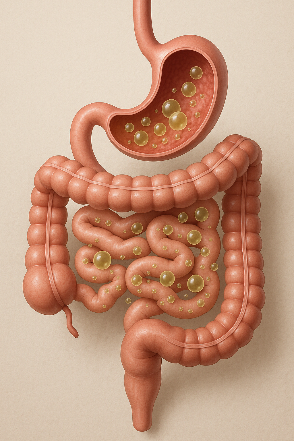 Every time you eat, bacteria in your gut help break down food. This fermentation produces gas — more if you eat high-fibre or hard-to-digest foods. The longer you’ve been eating during the day, the more gas accumulates.
