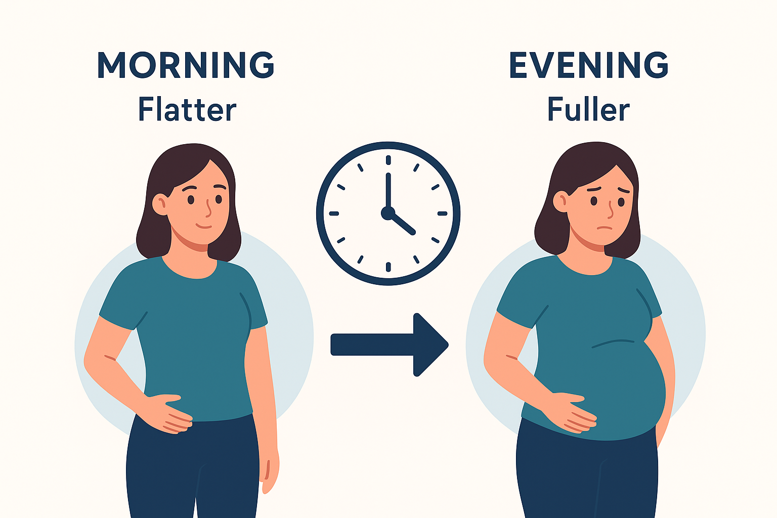 Once you start eating and drinking, digestion kicks into gear. Throughout the day, food moves through your digestive tract, water is absorbed, and bacteria in your gut ferment fibres and sugars — producing gas. By evening, the buildup of food, liquid, and gas can make your belly appear and feel fuller.