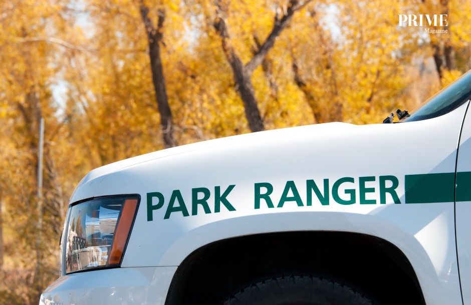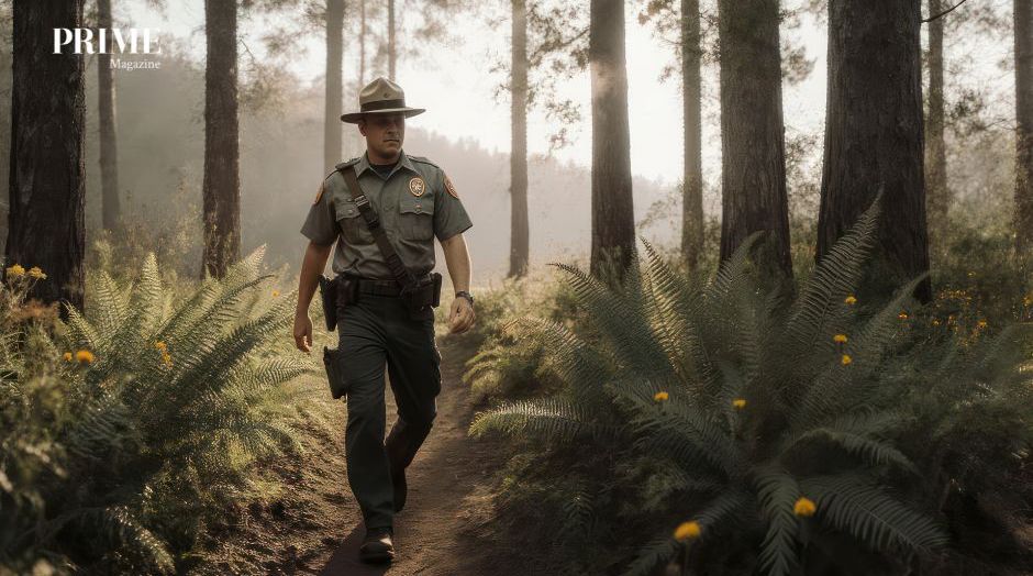 Park Ranger Walking Through Lush Forest Trail Surrounded by Fern