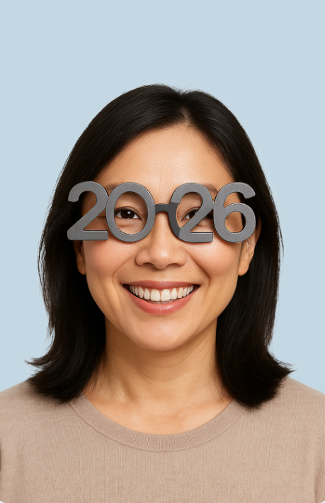 Portrait of a woman with eyeglasses displaying “2026” on the lens
