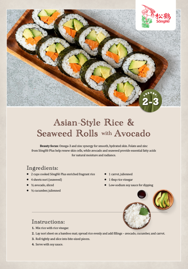 Eating well plays an important role in supporting skin health. Rice and seaweed rolls contain nutrients that help maintain hydration and promote a healthy complexion. Zinc supports skin repair, while omega-3 fatty acids help strengthen the skin barrier. Vitamin-rich vegetables further contribute to natural radiance from within.