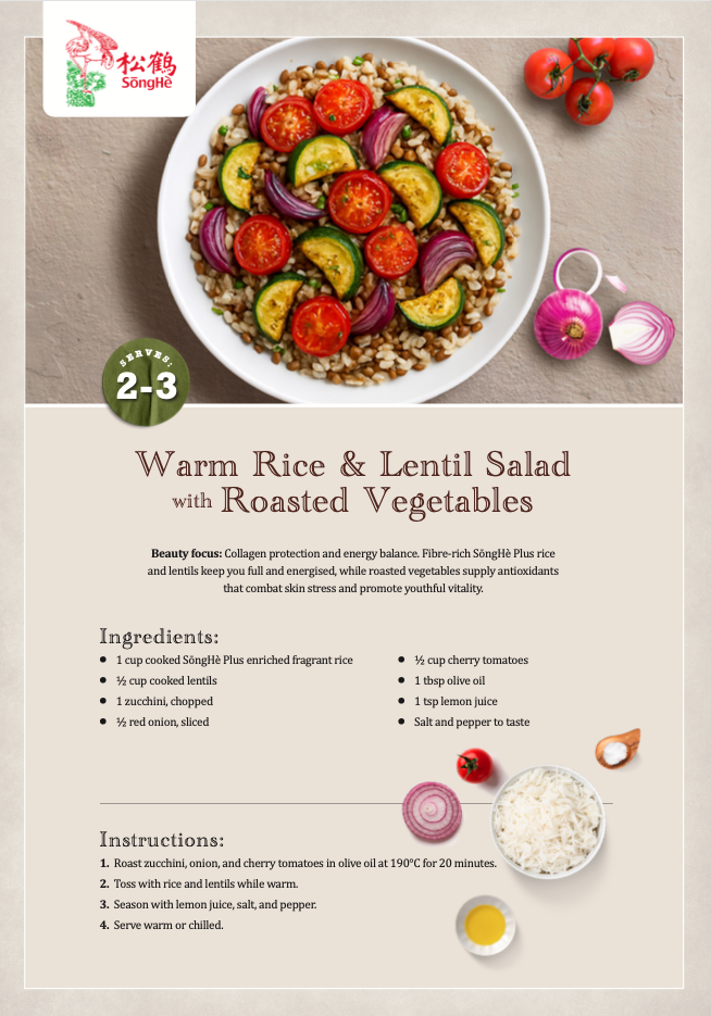 Collagen protection and energy balance. Fibre-rich SōngHè Plus rice and lentils help keep you full and energised, while roasted vegetables supply antioxidants that combat skin stress and support youthful vitality.