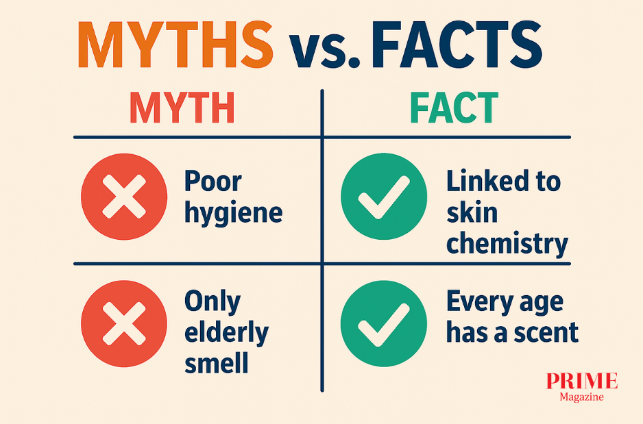 Fact: Every age has a scent profile. Teenagers smell different due to sweat and hormones. Middle-aged adults may smell faintly of “stale beer” from other compounds. Older people’s odor is just another stage of life.