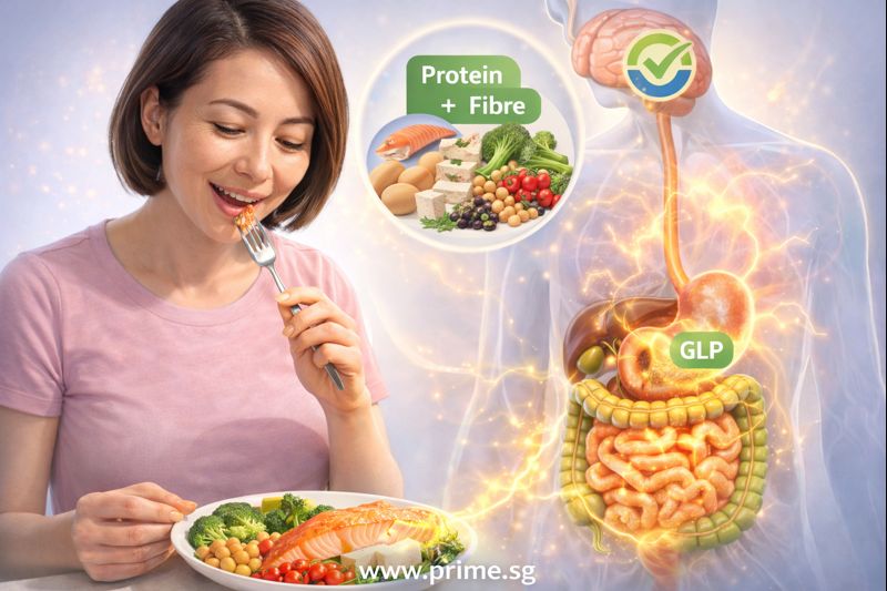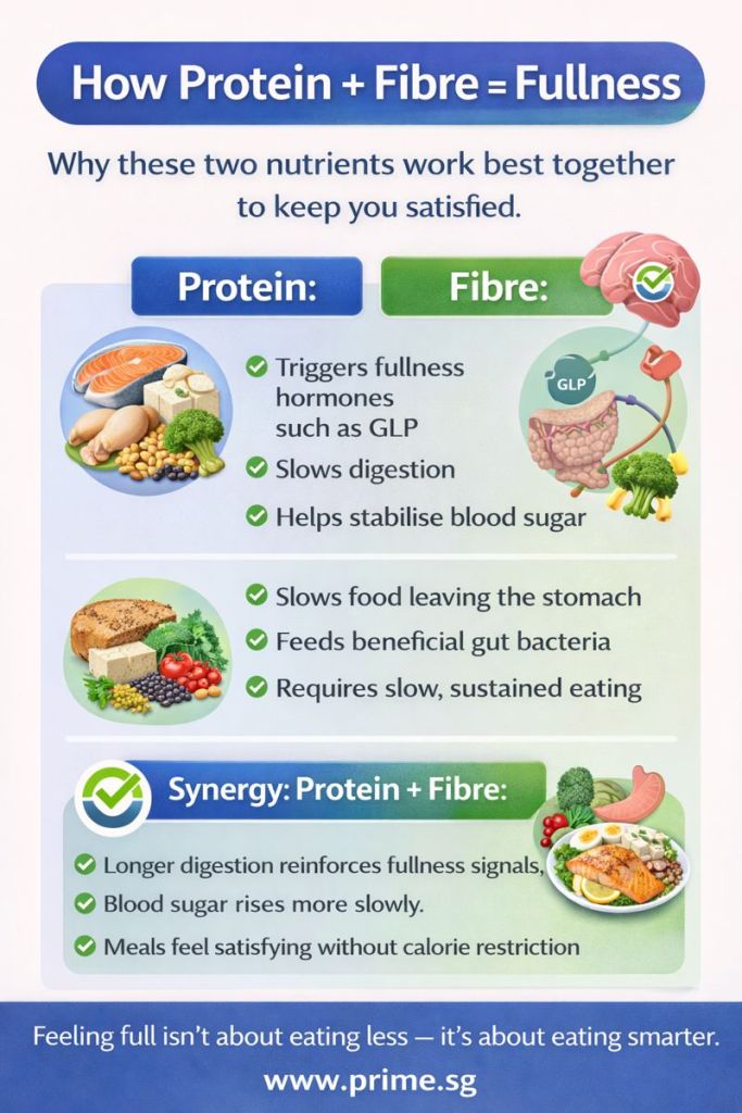 Two nutrients play an especially important role in this process: protein and fibre. When eaten together, they help activate the body’s natural fullness signals, including a gut hormone called GLP, making meals more satisfying and easier to sustain.